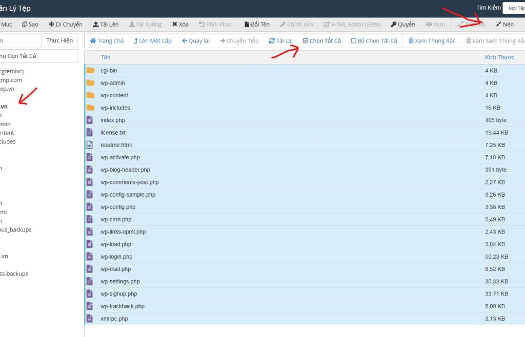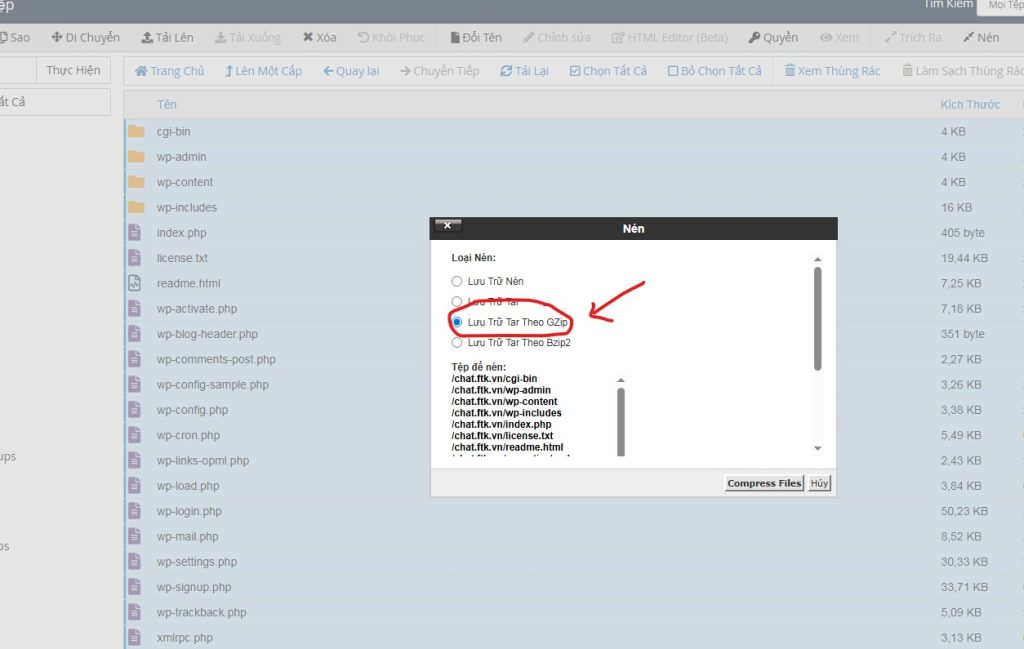 – Tại bảng cPanel, chọn bộ quản lý tệp, chọn thư mục website cần backup, chọn tất cả các file trong thư mục đó và bấm công cụ nén, chọn loại file nén là GZip và tiến hành nén, sau khi nén xong sẽ có một file nén xuất hiện ở thư mục đang chọn, bạn tải file nến đó về là đã lưu được database của website. Tải xong bạn có thể xóa file nén đó đi.