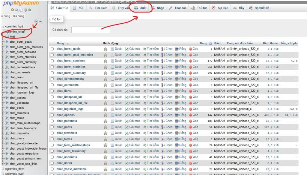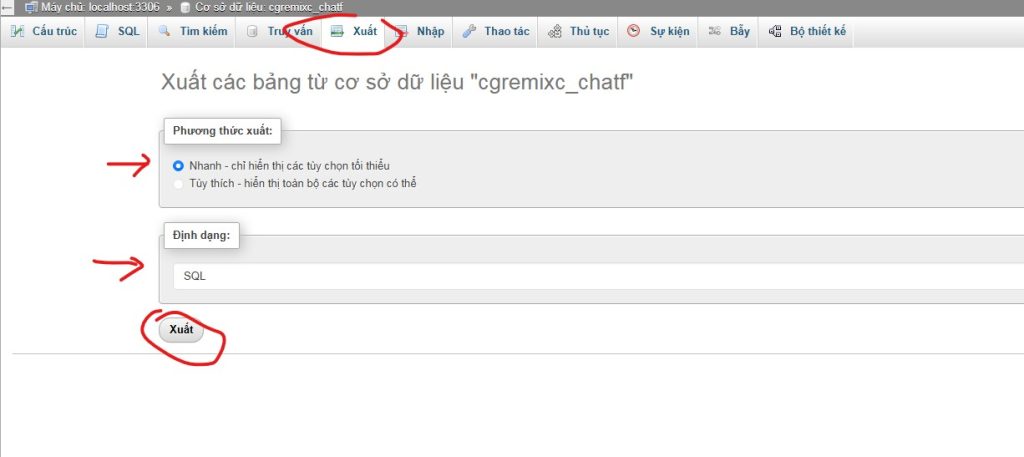 – Tại bảng cPanel, chọn phpMyAdimin, chọn cơ sở dữ liệu cần xuất (tên cơ sở dữ liệu có thể xem trong wp-config.php của database để đảm bảo chọn đúng cơ sở dữ liệu cần xuất) và nhấn nút “xuất”, để tùy chọn mặc định và bấm xuất, lưu file này là đã lưu được phpMyAdmin của website.