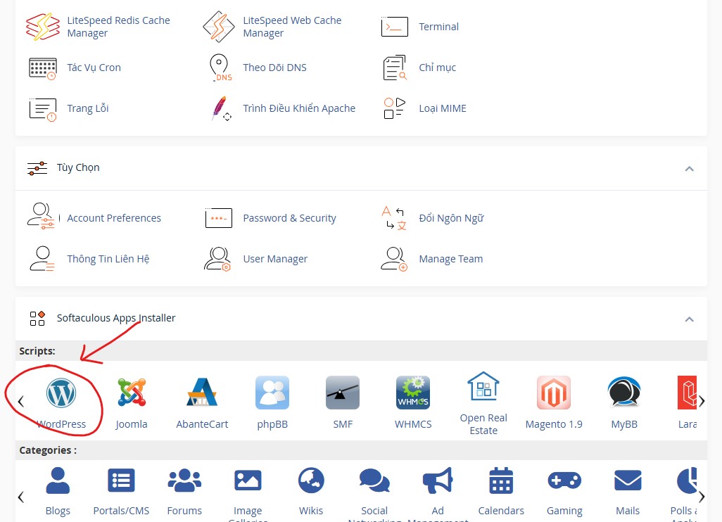 Bước 1: Truy cập cPanel của hosting (truy cập trang chủ hosting, đăng nhập, chọn dịch vụ và nút tắt đến cPanel). Tại cPanel chọn công cụ cài đặt nhanh wordpress để bắt đầu cài mới nhanh website wordpress.