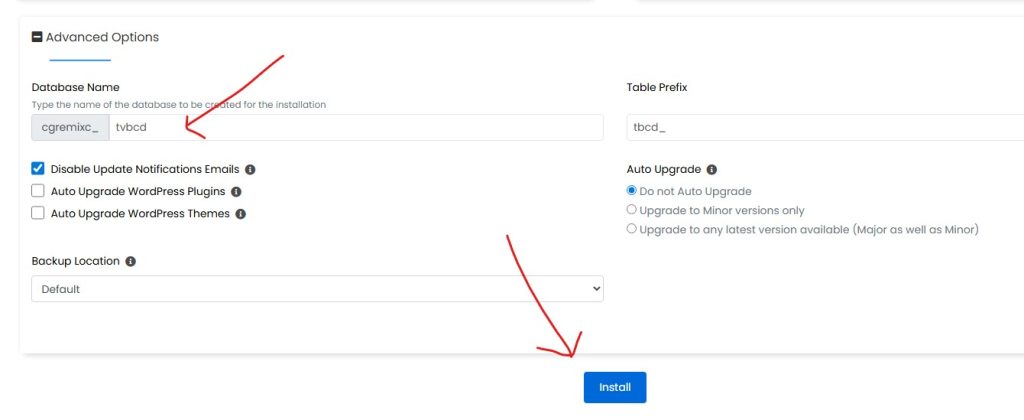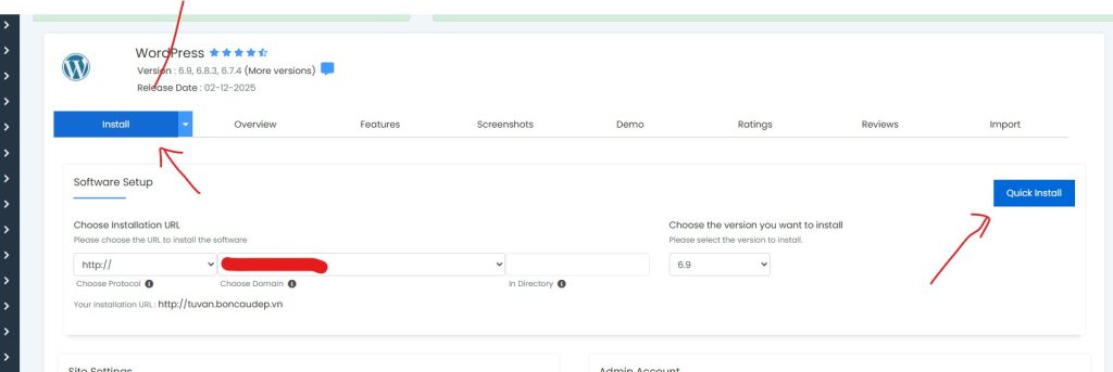 Bước 2: Chọn Install, chọn tên miền cần cài wordpress, điền thông tin cần thiết và bấm Install (nhớ xóa wp_ mặc định để cài website vào thư mục chính của hosting)